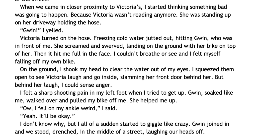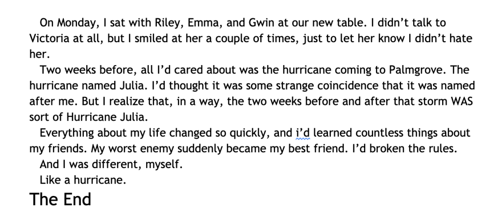 The hurricane also comes, but despite all the buildup, I barely even talk about it. Even though it was CATEGORY 5. A category 5 storm would not “just rain all day” when they are barely distanced from the eye. I obviously did not understand ANYTHING about hurricanes when I wrote this, but I’ll cut myself some slack.