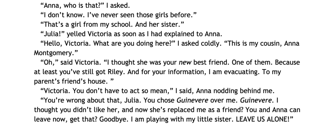 Back at home, Julia reunites with Riley and they agree to ditch Victoria and become friends with Gwin instead.