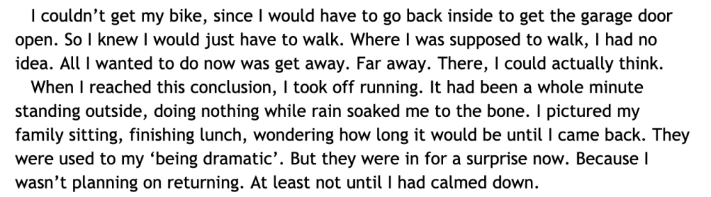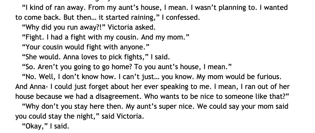 But then she chickens out and goes to Victoria’s parent’s friend’s house instead. (Because that’s what I needed to happen for dramatic purposes.)